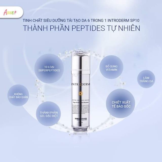 Introderm SP10 có thành phần chính là 10 loại Peptides (axit amin) – được coi là “hoạt chất vàng” chống lão hóa. Peptides giúp củng cố các chất lượng và số lượng Protein trong da, từ đó bổ sung lượng Collagen đã mất giúp da giữ, phục hồi được vẻ tươi trẻ, săn chắc. Chi tiết tại sao Peptides cực tốt trong tái tạo Collagen xem lại bài này: https://southernskincare.net/peptide-hoat-chat-vang-trong-lang-chong-lao-hoa/
