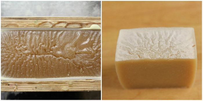 Nếu bạn chọn cách nhiệt xà phòng của mình, điều quan trọng là không để nó quá nóng. Nếu xà phòng xử lý lạnh trở nên cực kỳ nóng, nó có thể tạo thành “Bộ não người ngoài hành tinh” ở trên cùng. Dưới đây là một ví dụ về Alien Brain; chú ý kết cấu giống như bộ não lượn sóng và giai đoạn gel hoàn chỉnh trong toàn bộ xà phòng. Alien Brain là một vấn đề thẩm mỹ và không ảnh hưởng đến chất lượng của xà phòng.