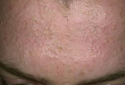 Mụn bắt đầu lan ra cả mặt lên trán, 2 bên má và nổi cả trong lông mày. Có hạt mụn lộ nhân trắng trên bề mặt da to bằng đầu tăm một thời gian thì nó bắt đầu đen vào như mụn đầu đen. Loại này thường có nhân trắng cứng, to bằng đầu tăm.